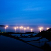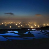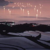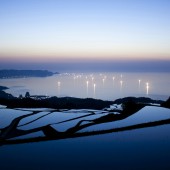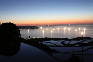 棚田と日本海に沈む夕日、イカ釣り漁船の漁り火を同時に眺める