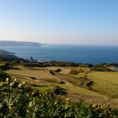 一般的な棚田は、山の中腹や山間部など急斜面の階段状に造成された水田ですが、向津具半島の東後畑は、東京ドームにして約129個分約600haにもなる大棚田と日本海の両方を一望できます。日が沈む時、棚田と海が茜色に染まる美しい瞬間は絶景です。1年を通じ表情が豊かな東後畑棚田は、1999年「日本の棚田百選」に選ばれ、全国で高い評価を受けています。