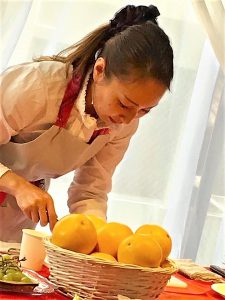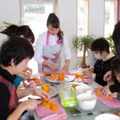 Instructor Rika giving a fruit cutting class in different prefecture who holds certificates as Fruit design master instructor and Fruit enzyme specialist as well. She is really friendly that leads many students to keep learnig in her class.